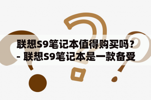 联想S9笔记本值得购买吗?- 联想S9笔记本是一款备受关注的高性能笔记本电脑。它采用了第八代英特尔酷睿i7处理器,8GB内存以及512GB SSD硬盘,这些配置相当强大。同时,该笔记本搭载了15.6英寸全高清IPS屏幕,能够提供出色的图像和视频显示效果。